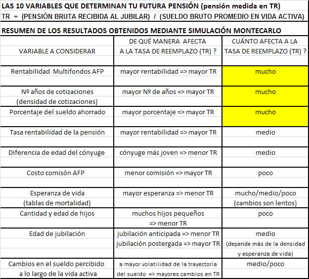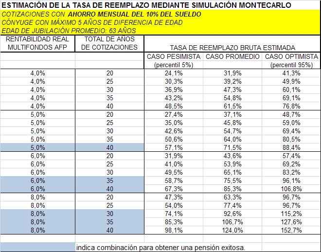 Conclusiones: La rentabilidad obtenida en los últimos 10 años de vida laboral, son más importantes que las rentabilidades de los primeros años de vida laboral (Ver Anexo 2). En promedio el sistema exige 10% de cotización, 6% de rentabilidad y 35 años de cotizaciones, si eso no pasa es muy probable que su tasa de reemplazo será menor al 70%, no se calcula la probabilidad sólo los casos de que eso ocurra, pero como veremos más adelante la probabilidad que eso ocurra es baja. La rentabilidad que siempre se publicita es el CARG (Rentabilidad anualizada) y no la conocida TIR (Tasa interna de retorno típicamente utilizada en evaluación de proyectos), para evaluar la verdadera rentabilidad de un sistema de capitalización individual sería necesario que nuestra AFP nos de la TIR porque es un mejor predictor de la tasa de reemplazo del sistema (Ver Anexo 2), además que nos permite evaluar el riesgo y volatibilidad de los fondo, más adelante podremos ver, que si los evaluamos nos podemos dar cuenta que la relación riesgo/retorno de los multifondos es baja.
